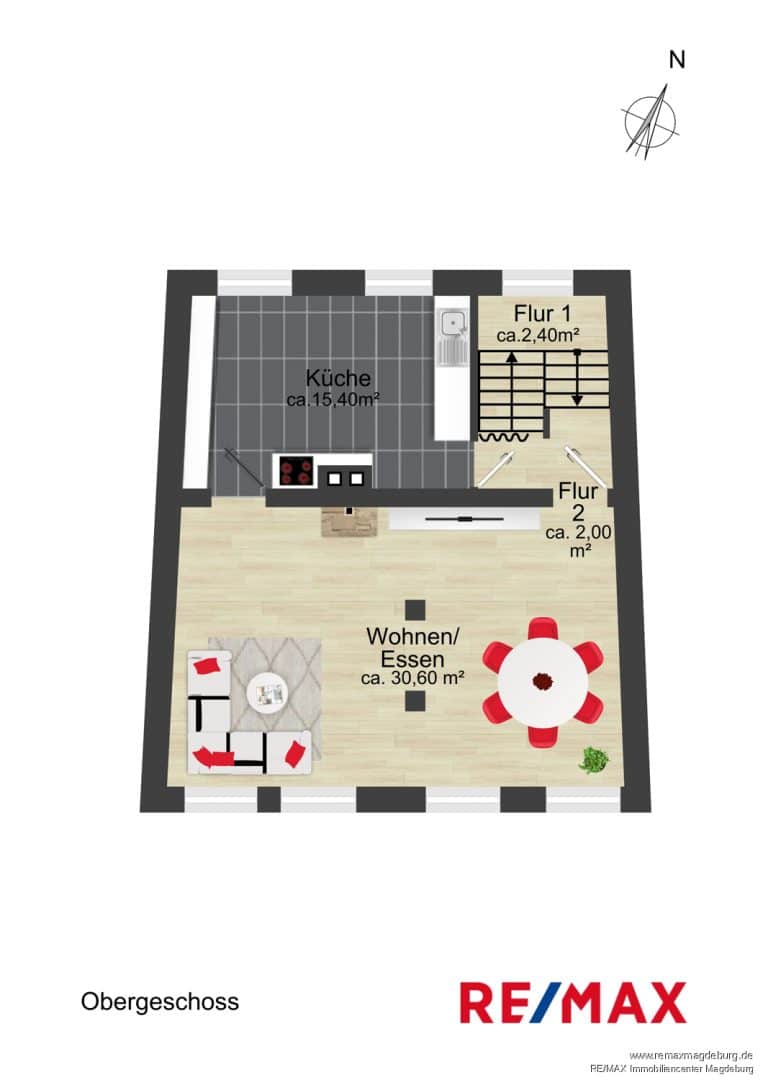 Das Obergeschoss bildet mit seiner Küche und dem großzügigen Wohn- und Essbereich den zentralen Mittelpunkt des Hauses. Ein gemütlicher Kamin setzt hier einen besonderen Akzent und schafft gerade in den kühleren Monaten eine behagliche Atmosphäre. So entsteht Raum für gemeinsames Kochen, gesellige Abende und entspannte Stunden mit Familie und Freunden. Die durchdachte Aufteilung sorgt für eine angenehme Wohnatmosphäre und vielfältige Gestaltungsmöglichkeiten.