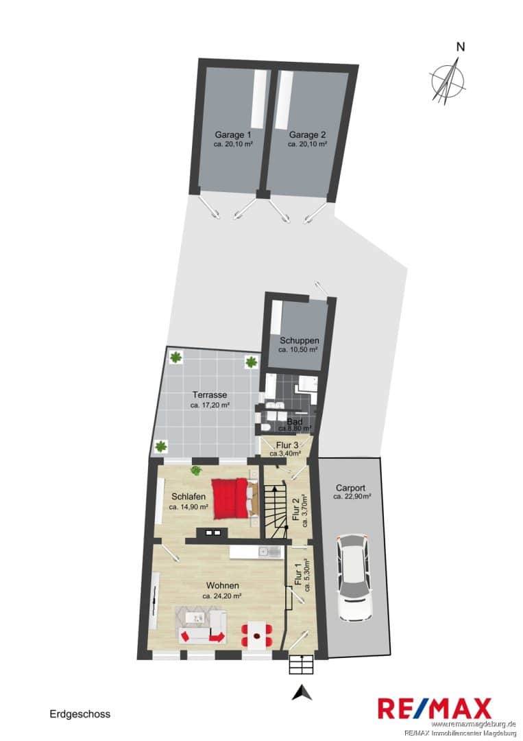 Im Erdgeschoss empfängt das Haus mit mehreren Flurbereichen, die die einzelnen Räume angenehm voneinander trennen. Neben einem Wohnraum und einem Schlafzimmer befindet sich auf dieser Ebene auch ein Badezimmer, wodurch ein komfortables Wohnen auf einer Etage möglich ist – ein nicht zu unterschätzender Vorteil im Alltag.