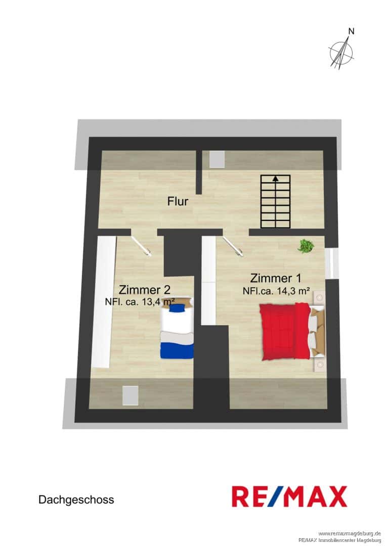 Das Dachgeschoss ergänzt das Raumangebot um zwei weitere Räume, die sich besonders gut als praktische Nutz- und Abstellflächen eignen. Hier findet alles seinen Platz, was im Alltag nicht ständig benötigt wird – von Vorräten bis hin zu Hobby- oder Dekorationsartikeln. Ein zentraler Flur verbindet die Räume und sorgt für eine übersichtliche Gliederung dieser Ebene.