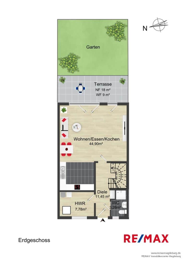 Schon beim Eintreten heißt Sie die helle Diele willkommen und führt Sie in den offenen Wohn- und Essbereich. Hier verschmelzen Kochen, Essen und Wohnen zu einem Zentrum des Zusammenlebens. Große Fensterflächen sorgen für Licht und eine freundliche Atmosphäre, während der direkte Zugang zur Terrasse den Blick in den eigenen Garten eröffnet. Ob Sommerfeste mit Freunden, Kindergeburtstage oder entspannte Grillabende – hier entstehen Erinnerungen fürs Leben. Für zusätzliche Funktionalität im Alltag sorgen ein Badezimmer mit Dusche und ein praktischer Hauswirtschaftsraum.