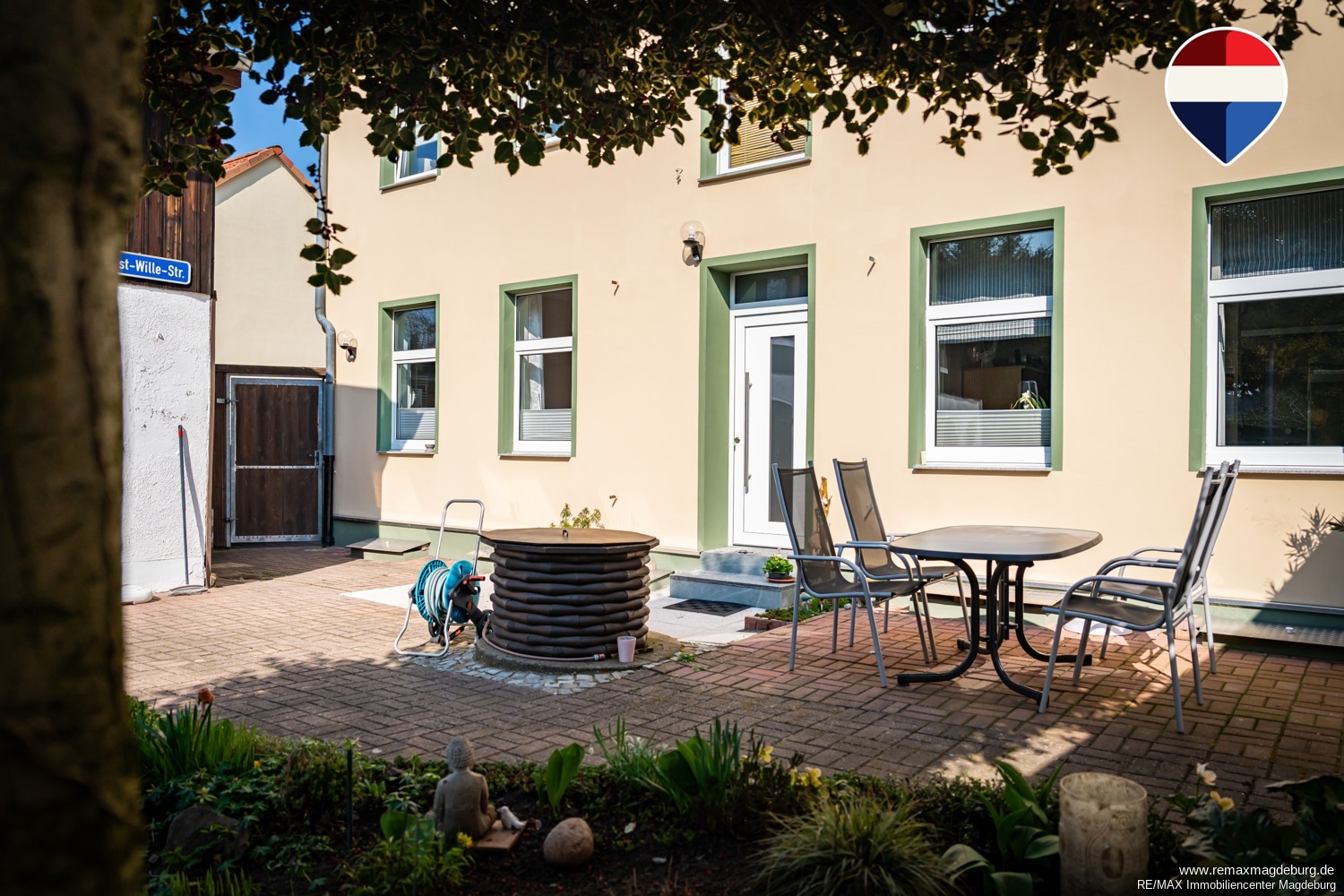 Der Außenbereich des Hauses überzeugt mit einer gepflasterten Terrassenfläche, die zu geselligen Stunden im Freien einlädt, sowie einem angrenzenden Gartenbereich, der Raum für Erholung, Spiel oder gärtnerische Gestaltung bietet.